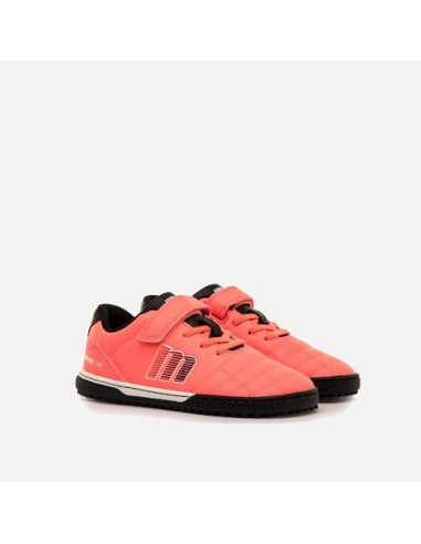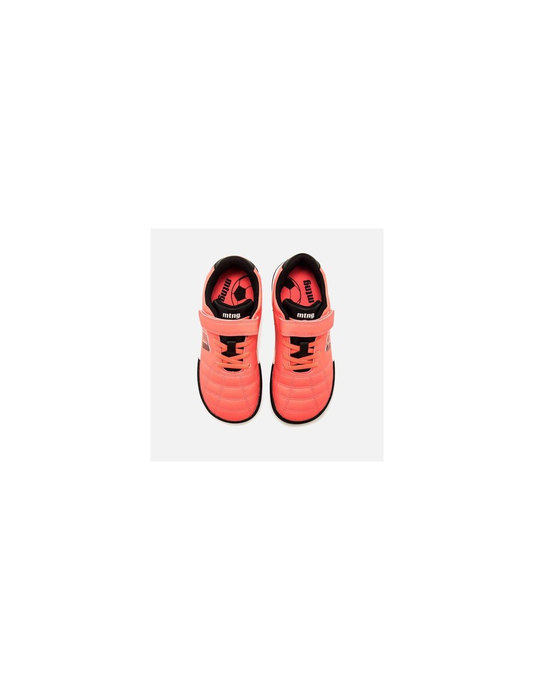 Zapatilla de fútbol barefoot de color coral flúor para niña de la marca Mustang, modelo Free Play con detalles en negro y blanco. Diseñada para resistir el ritmo activo diario, incorpora puntera reforzada que protege el corte frente a la abrasión por contacto con el suelo. El cierre adhesivo de cosido reforzado y los cordones elásticos garantizan un ajuste cómodo y seguro. La suela de goma incluye pequeños tacos que mejoran la tracción y el agarre. Diseñado y desarrollado especialmente en colaboración con el Dr. Juanjo López, traumatólogo deportivo e infantil, para respetar el desarrollo natural del pie del niño y la niña. Gracias a su puntera ancha permite el libre movimiento de los dedos dentro del zapato. Las plantillas extraíbles facilitan comprobar si la talla del calzado es la correcta para tu hijo. Además, su fácil apertura facilita que el niño pueda descalzarse y calzarse de forma autónoma.